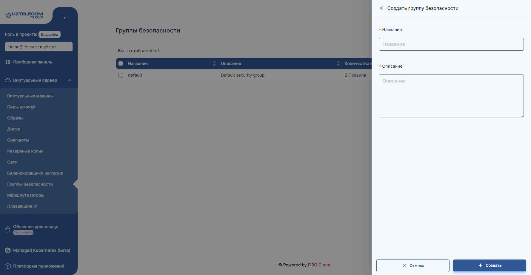 - Enter the Name and Description fields and click the Create button to create a new Security group.